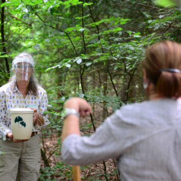 Vom Weg geht es nun ein paar Schritte in den Wald hinein, wo einige Bäume mit blauen und gelben Bändern gekennzeichnet sind. Sie zeigen an, dass man sie sich noch als letzte Ruhestätte aussuchen kann. Blaue Bänder kennzeichnen Bäume, die man für sich und seine Familie für ursprünglich bis zu 99 Jahre sichern konnte. Da es den Friedwald hier inzwischen seit 2013 gibt, sind es inzwischen noch 92 Jahre. Gelbe Bändern kennzeichnen Gemeinschaftsbäume, wo man einzelne Plätze für 15 Jahre erwerben kann. Die Zahl der Bestattungsplätze und Preise hängt von verschiedenen Faktoren wie etwa der Größe des Baumes ab, wie Anne Chomiak der Gruppe aus einem Dutzend Interessenten erklärt, die in Coronazeiten mit Mundschutz und Abstand im Wald steht und die Bäume genau ansieht. Neben den Bändern gibt es Nummern und Farben, die die Kosten angeben. Je besser die Lage und je dicker der Baum, desto mehr Bestattungsplätze und desto höher auch die Kosten, erklärt Chomiak der Gruppe. Auch günstige Varianten ohne die freie Baumwahl gibt es.
