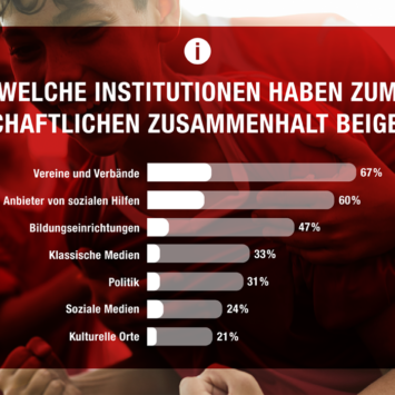 Corona lässt das Wir-Gefühl in der Gesellschaft schwinden. Das zeigt eine repräsentative Umfrage, die der Deutsche Caritasverband im Dezember sowie Anfang Januar vom Institut Forsa durchführen ließ und an der jeweils 1.000 Personen über 14 Jahre teilnahmen. 72 Prozent der befragten Menschen in Deutschland äußerten dabei die Meinung, der gesellschaftliche Zusammenhalt habe durch die Pandemie gelitten. Zwei Drittel sagten aber auch: Institutionen, bei denen sich Menschen ehrenamtlich für andere engagieren, sowie Anbieter von sozialen Hilfen haben in dieser Zeit am meisten dazu beigetragen, die Gesellschaft zusammenzuhalten. Der Beitrag der Medien, der Politik und kultureller Institutionen zum Zusammenhalt in der Pandemie wurde dagegen eher gering bewertet.