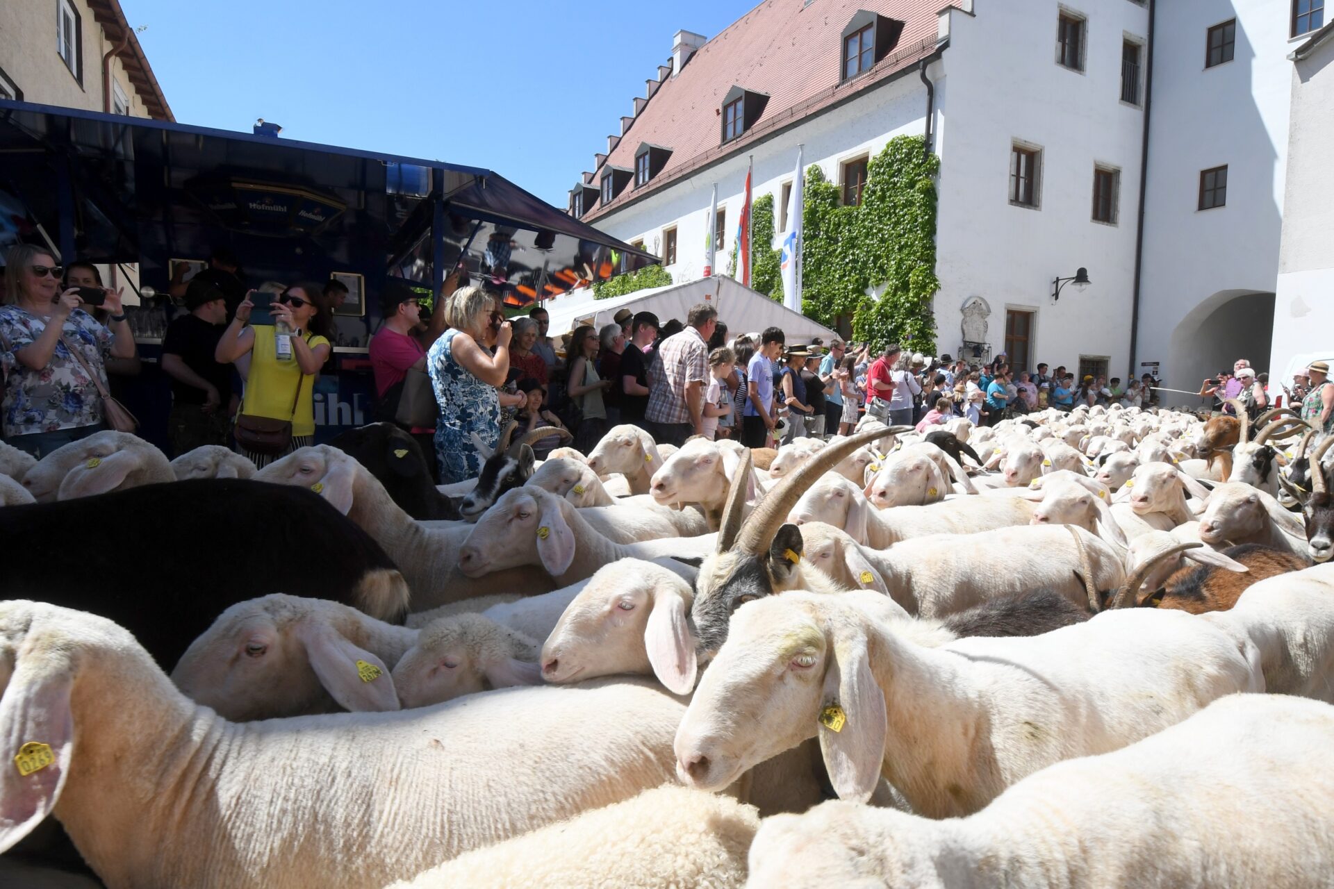 Nach dem offiziellen Teil erhielt Holetschek dann ein neues Gewand: Schäfereivorsitzender Erich Neulinger unterstützte ihn beim Anlegen der Schäfertracht. Über 700 Schafe, Lämmer und Ziegen zogen durch die Straßen und Gassen von Mörnsheim, allen voran der Minister, die frisch gekrönte Lamm-Königin samt ihrer Amtskollegin, der bayerischen Kartoffelkönigin Verena Wenger, sowie der Limeskönigin Kerstin Hausmann aus Kipfenberg, dem Bürgermeister und der Schäfergilde. Angeführt wurde die Herde von Schäfer Sascha Gäbler, der seine wolligen Zeitgenossen und vierbeinigen Rasenmäher über den Marktflecken auf die Sommerweide führte.