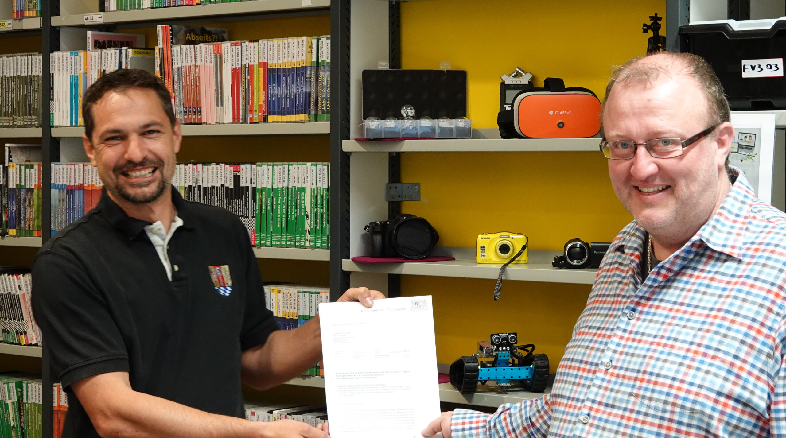 Über den siebenstelligen Förderbescheid freuen sich (v.r.n.l) Andreas Glöckl, Leiter des Medienzentrums Eichstätt, und Florian Vollnhals, IT-Verantwortlicher des Landkreises Eichstätt für die Landkreisschulen. Foto: Bauernfeind/Medienzentrum Eichstätt