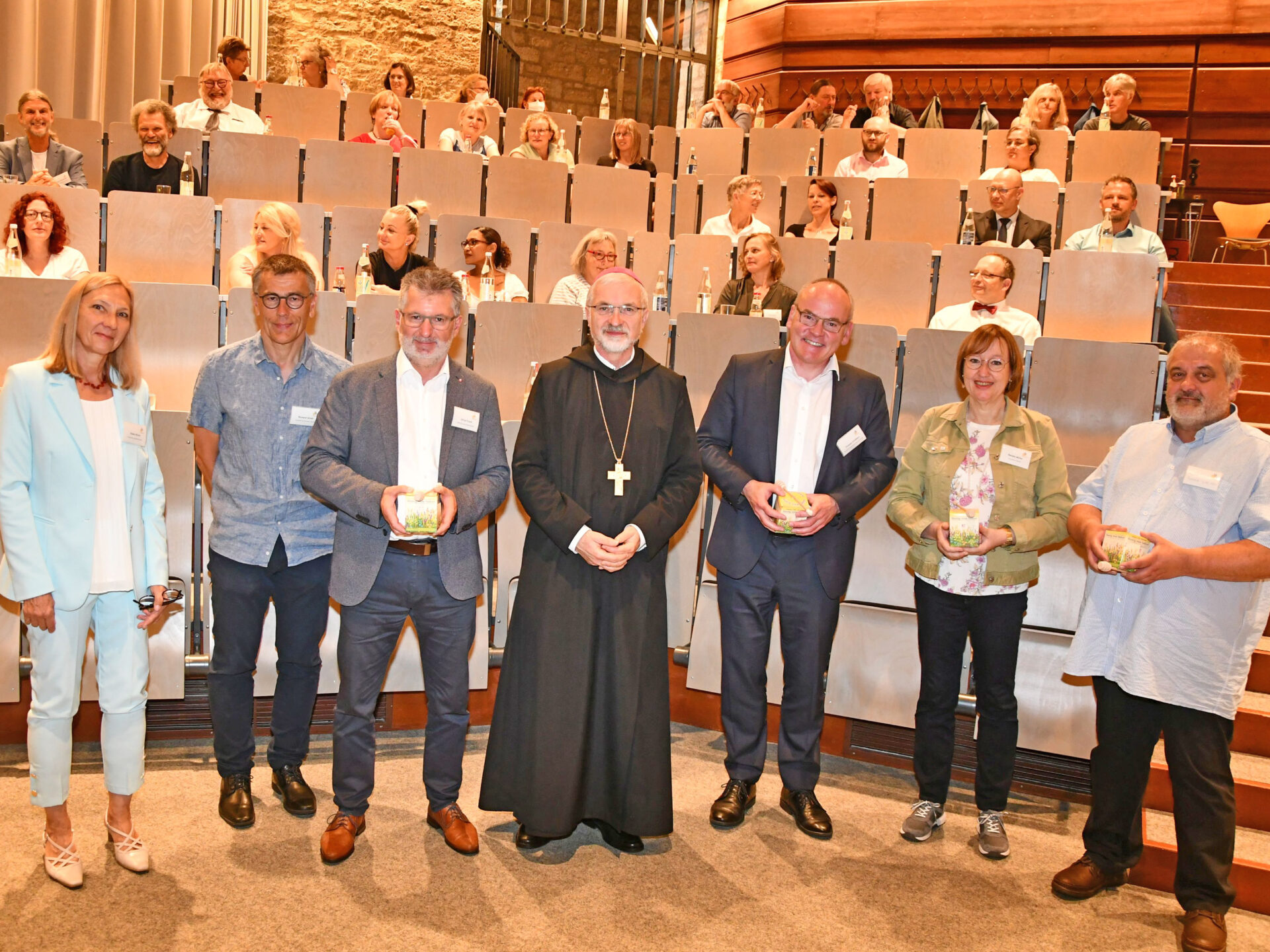 Über das 25-jährige Jubiläum der Diözesanen Arbeitsgemeinschaften der Mitarbeitervertretungen freuten sich (von links) die Vorsitzenden der Arbeitsgemeinschaften Gisela Hirsch und Richard Ulrich, Caritasdirektor Alfred Frank, Bischof Gregor Maria Hanke, der Amtschef des Bischöflichen Ordinariates, Thomas Schäfers, die Vorsitzende der Bundesarbeitsgemeinschaft der MAVen, Renate Müller, und der Sprecher der Landesarbeitsgemeinschaft, Martin Lieble. Foto: Peter Esser/pde