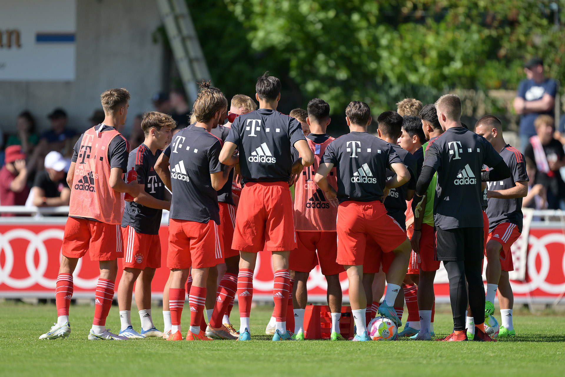 Bei sommerlicher Hitze tasteten sich beide Mannschaften zunächst ab, wobei sich Bayern München wie erwartet mehr Spielanteile erarbeitete. Chancen aber blieben gegen stabil stehende Gastgeber zunächst Mangelware – bis zur 14. Minute, als Neuzugang Hyunju Lee sofort zuschlug: Nach einer Maßflanke von Lucas Copado Schrobenhauser stand das 18-jährige Talent aus Südkorea völlig frei und köpfte zur Führung ein. Nach einem weiteren Kopfball nach Freistoßflanke verpasste David Herold das VfB-Tor nur knapp.