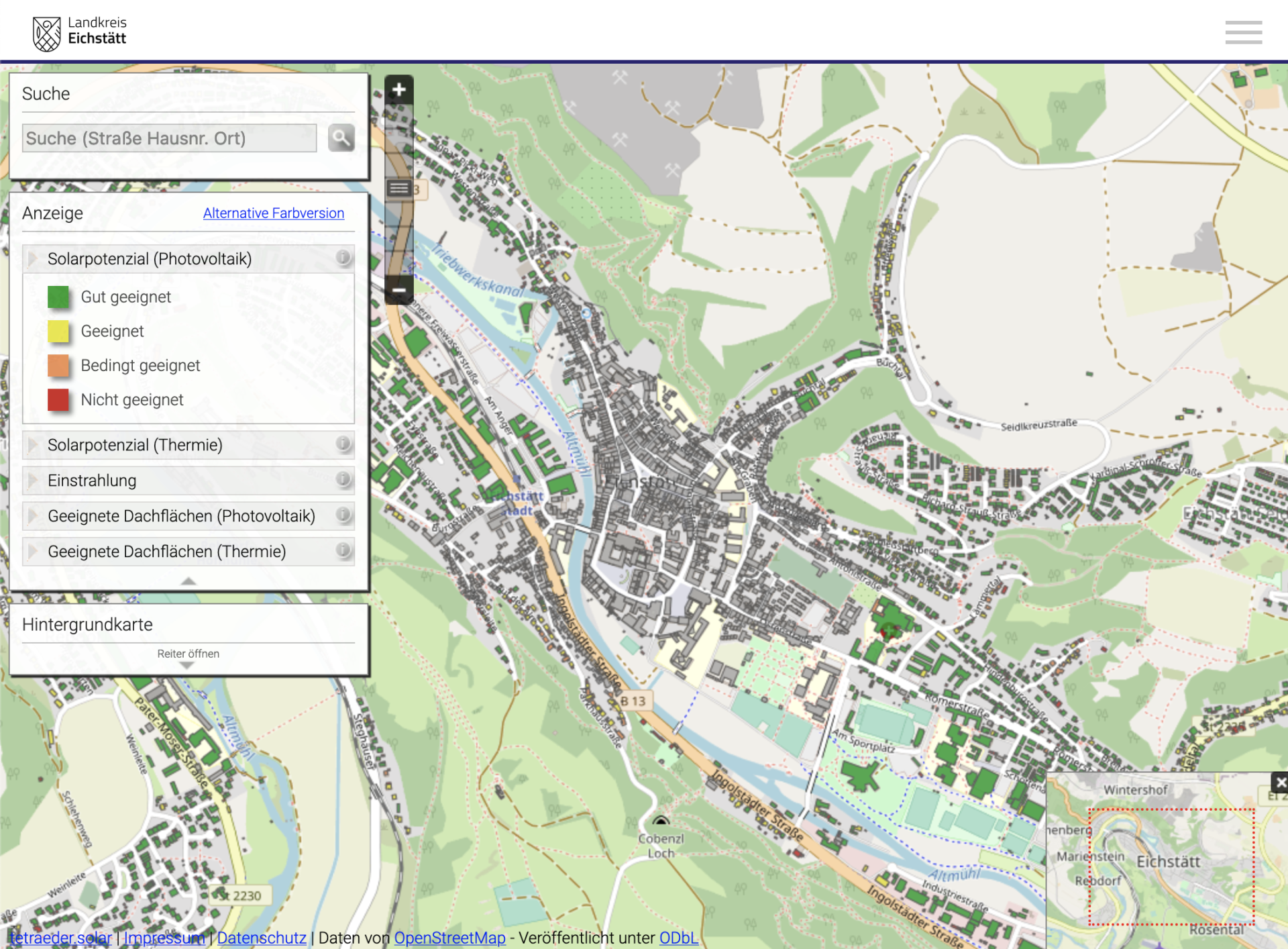 Das Solarpotentialkataster ist direkt online abrufbar unter www.solare-stadt.de/landkreis-eichstaett oder über eine Verlinkung auf der Webseite des Landratsamtes. Die Informationen dienen der Erstorientierung und ersetzen keine Fachberatung durch einen qualifizierten Ingenieur.