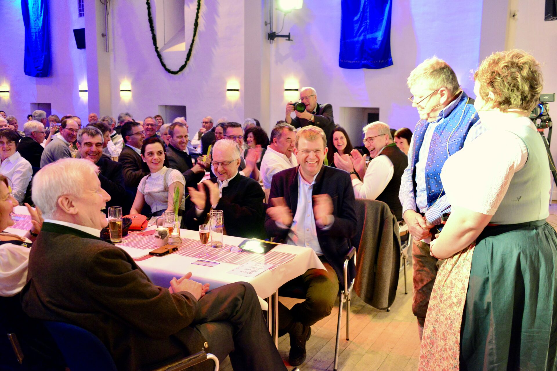 Und natürlich wurde auch an den Tischen im Saal kräftig angestoßen – besonders, wenn der Stadttürmer, gespielt von Julius Beck – mit der Eichstätter Stadtkapelle auf der Bühne ein Prosit der Gemütlichkeit oder seinen „Eichstätt-Refrain“ anstimmte („Hast es scho g‘seng – Eichstätt im Altmühltal? Hast es scho g’seng, Eichstätt im Tal? Wer‘s g’seng hat, der muss‘ gern ham, und wer‘s gern hat, der muss‘ g’seng ham“) und der ganze Saal mehr oder weniger inbrünstig mitsang. Der Stadttürmer grantelte auch gehörig und in Reimform über Politiker ohne Hirn, Klimaaktivisten, die sich festkleben (Sein Rat dazu: „Lasst sie beppen, die Deppen!“) oder das Gendern, das die Sprache verstümmle – am Ende werde der Eichstätter Dom in der weiblichen Form noch zur „Domina“. „Feminismus recht und schee, aber muaß ma so weit geh?“, fragte er – natürlich rhetorisch.