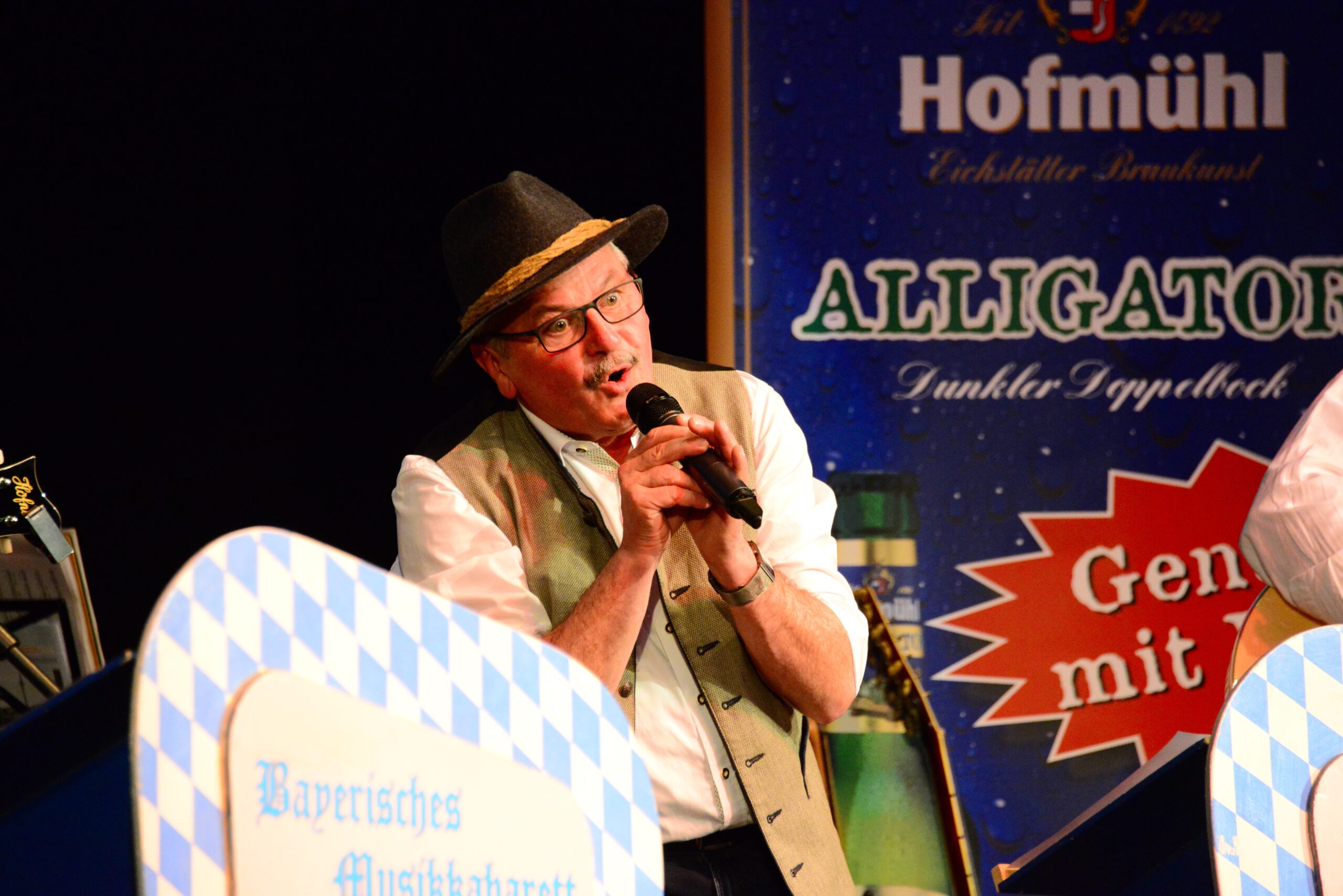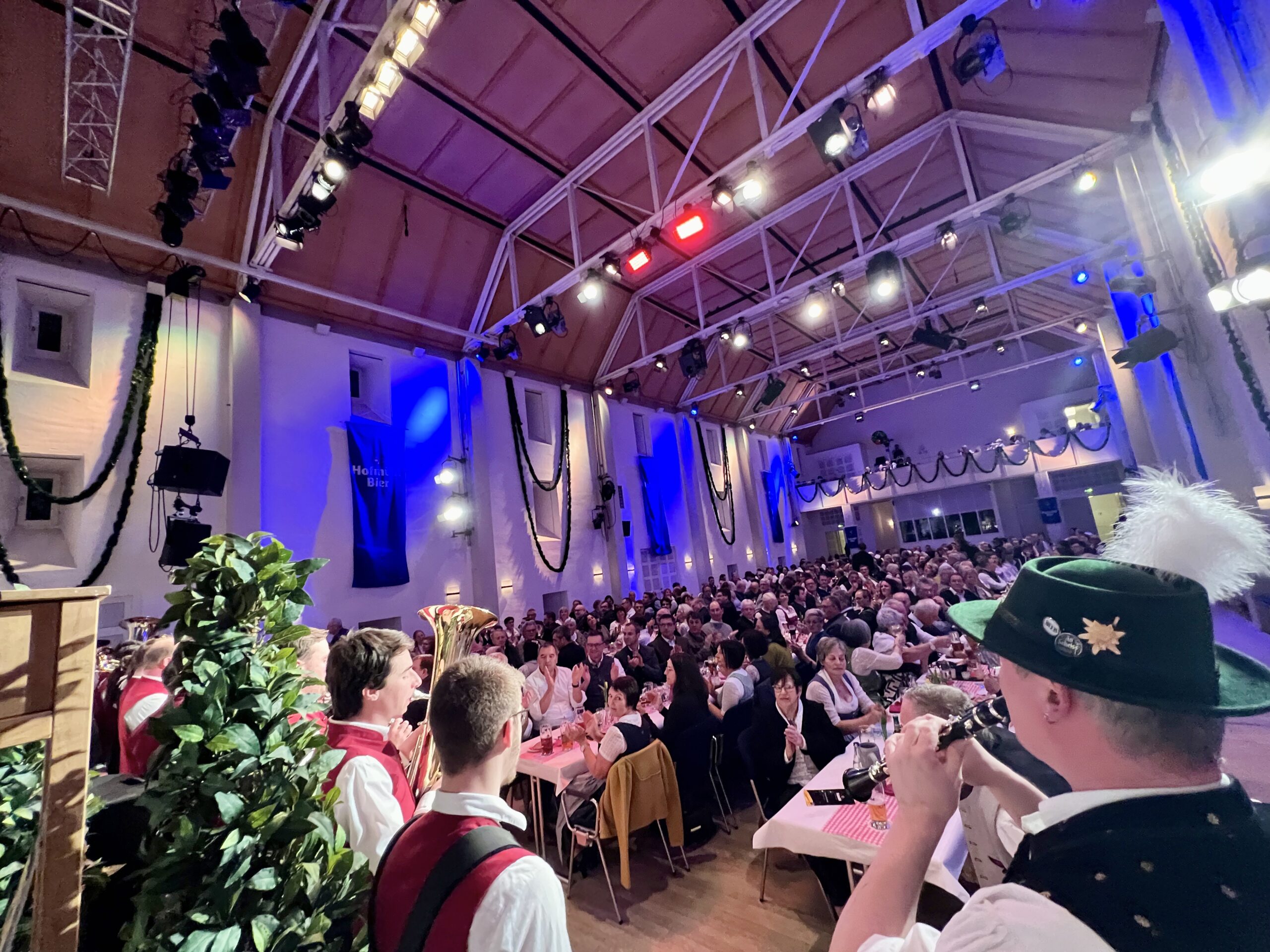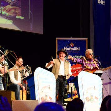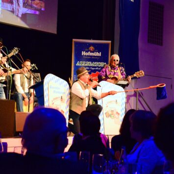 Und natürlich wurde auch an den Tischen im Saal kräftig angestoßen – besonders, wenn der Stadttürmer, gespielt von Julius Beck – mit der Eichstätter Stadtkapelle auf der Bühne ein Prosit der Gemütlichkeit oder seinen „Eichstätt-Refrain“ anstimmte („Hast es scho g‘seng – Eichstätt im Altmühltal? Hast es scho g’seng, Eichstätt im Tal? Wer‘s g’seng hat, der muss‘ gern ham, und wer‘s gern hat, der muss‘ g’seng ham“) und der ganze Saal mehr oder weniger inbrünstig mitsang. Der Stadttürmer grantelte auch gehörig und in Reimform über Politiker ohne Hirn, Klimaaktivisten, die sich festkleben (Sein Rat dazu: „Lasst sie beppen, die Deppen!“) oder das Gendern, das die Sprache verstümmle – am Ende werde der Eichstätter Dom in der weiblichen Form noch zur „Domina“. „Feminismus recht und schee, aber muaß ma so weit geh?“, fragte er – natürlich rhetorisch.