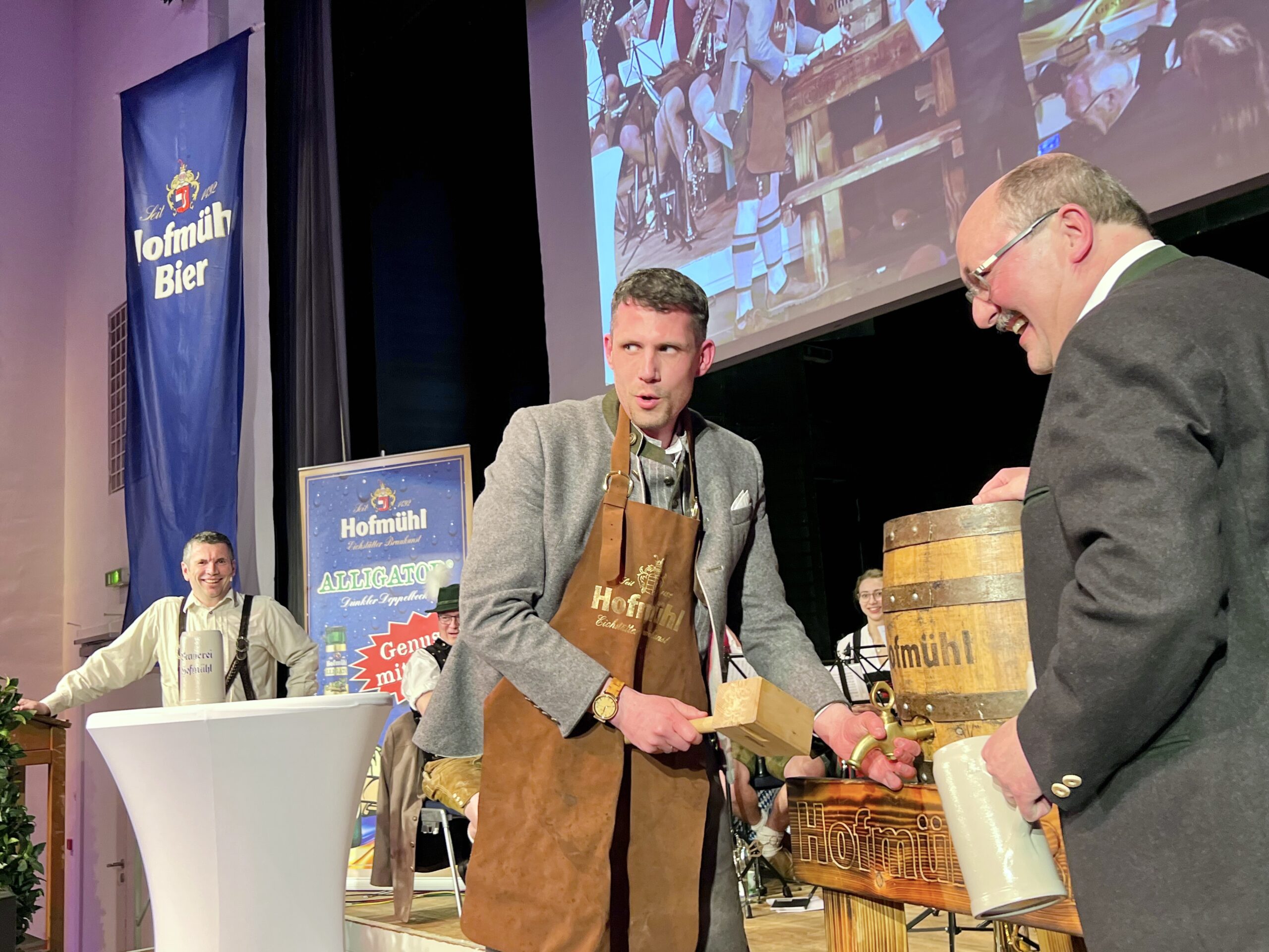 Das Thema wurde dann auch zu einer Art „Running Gag“, der am Abend immer wieder auftauchte – selbst beim eigentlichen Starkbieranstich selbst: Als Oberbürgermeister Josef Grienberger im Beisein von Hofmühl-Chef Stephan Emslander das erste Fass Starkbier anzapfen sollte, schien alles nach zwei Schlägen schon erledigt. „Der ist drin“, bestätigte Emslander auf die Frage des OB. Doch dann sprang der Zapfhahn doch wieder raus und sorgte für den nächsten Lacher im Saal – und der OB scherzte, das sei ja wie im Stadtrat: Da müsse auch „manches wiederholt werden“. Und so wurden es dann zwei Schläge bis zum obligatorischen „O’zapft is“ – allerdings auch erst im zweiten Anlauf. Anschließend aber floss das dunkle, würzige Gebräu und landete in den Masskrügen der Ehrengäste – darunter etwa der Bundestagsabgeordnete Reinhard Brandl (CSU), Landtagsmitglied Eva Gottstein (FW), Landrat Alexander Anetsberger (CSU) und zahlreiche Bürgermeister – wie etwa Helmut Schloderer aus Beilngries und andere Amt- und Würdenträger.