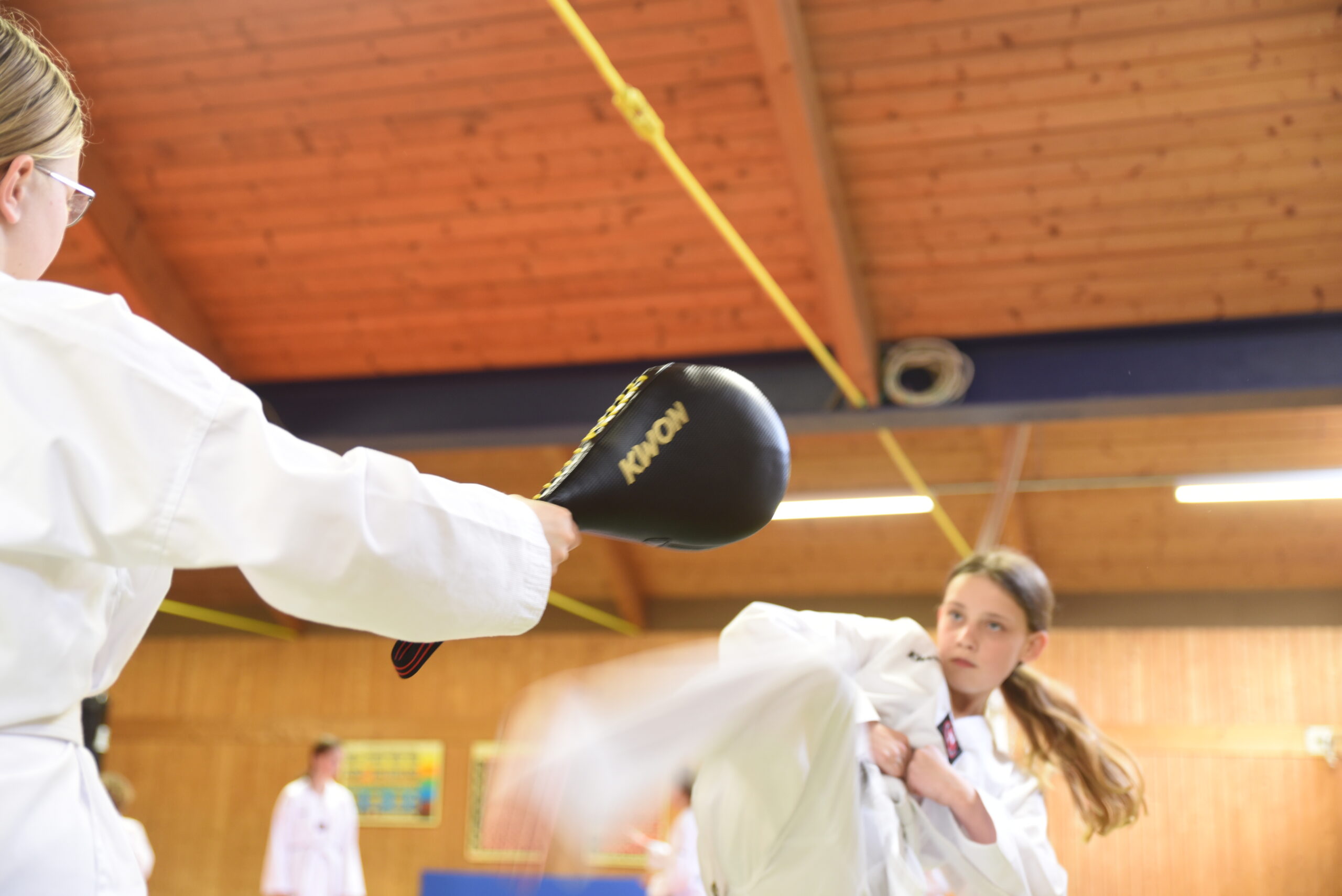 Doch auch ohne den Zweikampf üben sich die Sportler in einer wettkampftauglichen Disziplin: dem Formenlaufen. Hierbei geht es darum, eine Art Choreografie aus zum Teil spektakulären Techniken zu zeigen und die Ausführung jener zur Perfektion zu bringen. Körperbeherrschung par excellence. Doch egal, ob der Schwerpunkt einer Einheit auf Selbstschutztraining, Koordinations- und Kraftentwicklungstraining, koordiniertem Wettkampf oder dem Techniktraining mit dem Formenlauf liegt: „Der Spaß ist noch nie zu kurz gekommen“, sagt Angelika Bußmann. „Spätestens wenn die Pratzen, also die Schlagpolster zum kraftvollen Üben der Techniken auf ein Ziel, ausgepackt werden, haben alle ihr Mittagstief überwunden und sind voll bei der Sache. Vielen sieht man es richtig an, wie gut es ihnen tut, ihren Kräften gefahrlos und in geschützter Umgebung freien Lauf zu lassen und die Kraftentwicklung ihres Körpers zu spüren.
