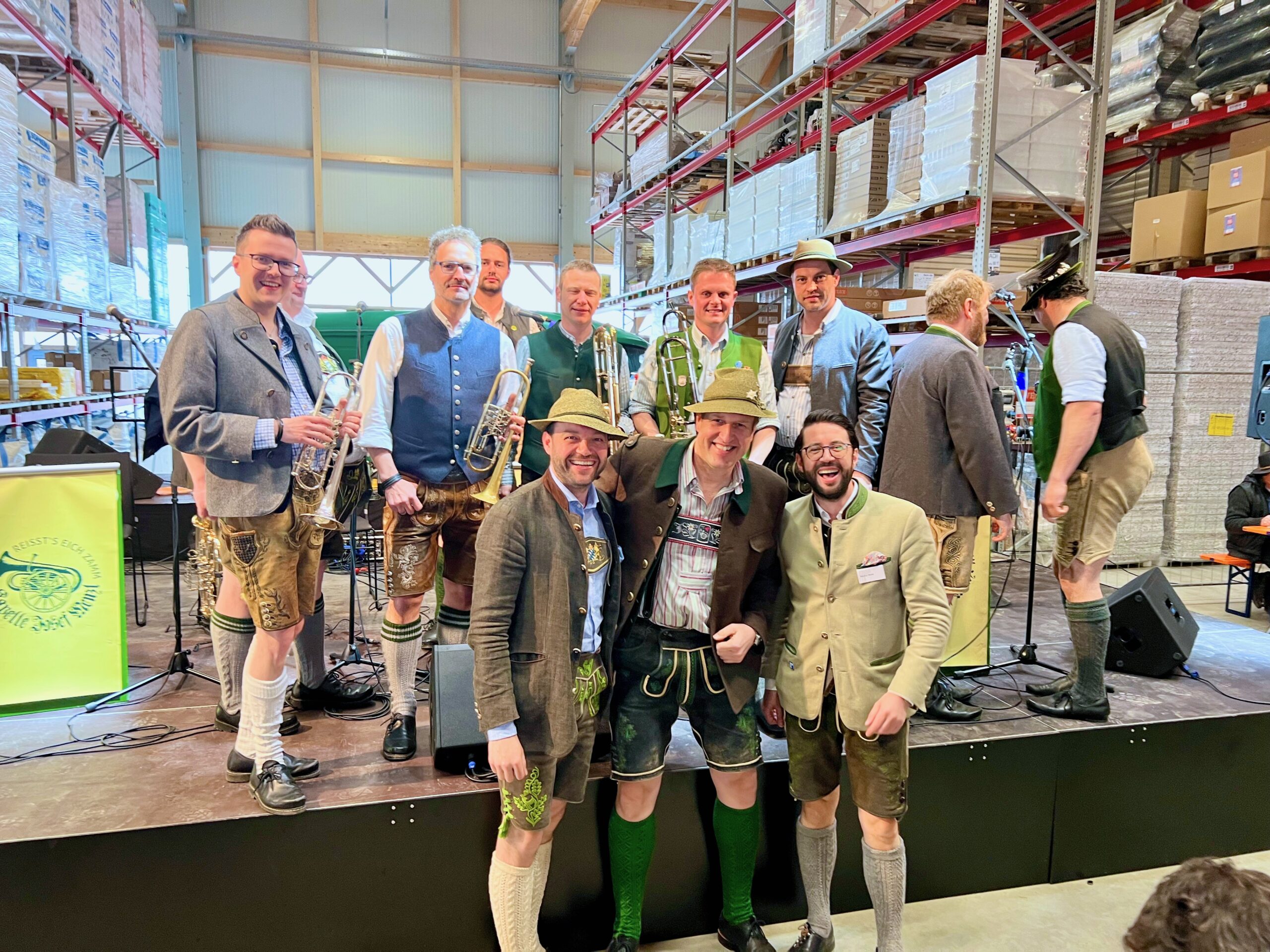 Und als abends im Preither Gewerbegebiet allmählich wieder Ruhe einkehrte, ging drüben in der neuen Baustofflogistikhalle der Festbetrieb erst richtig los: Die gewaltige Halle mit ihrer beeindruckenden Holzkonstruktion wurde zur Festhalle für das „Baustofffest“, wie die Kapelle Josef Menzl das ganze Event kurzerhand taufte. „Reisst’s Eich zamm“ – so steht es auf den Aufstellern mit dem Logo der Band auf der Bühne. Stattdessen aber taten Josef Menzl und seine launigen Topmusiker, die sich nach ihren Auftritten auf der letztjährigen Münchner „Wiesn“ selbst ironisch als „die schlechteste Oktoberfest-Kapelle der Welt“ bezeichnet hatte – der Vorwurf lautete damals, sie habe zu wenig Popsongs gecovert und deshalb für zu wenig Stimmung gesorgt – das Gegenteil: nämlich alles dafür, dass die Stimmung dann eben doch richtig Schwung aufnahm und am Ende gleich mehrfach Zugaben gespielt werden mussten.