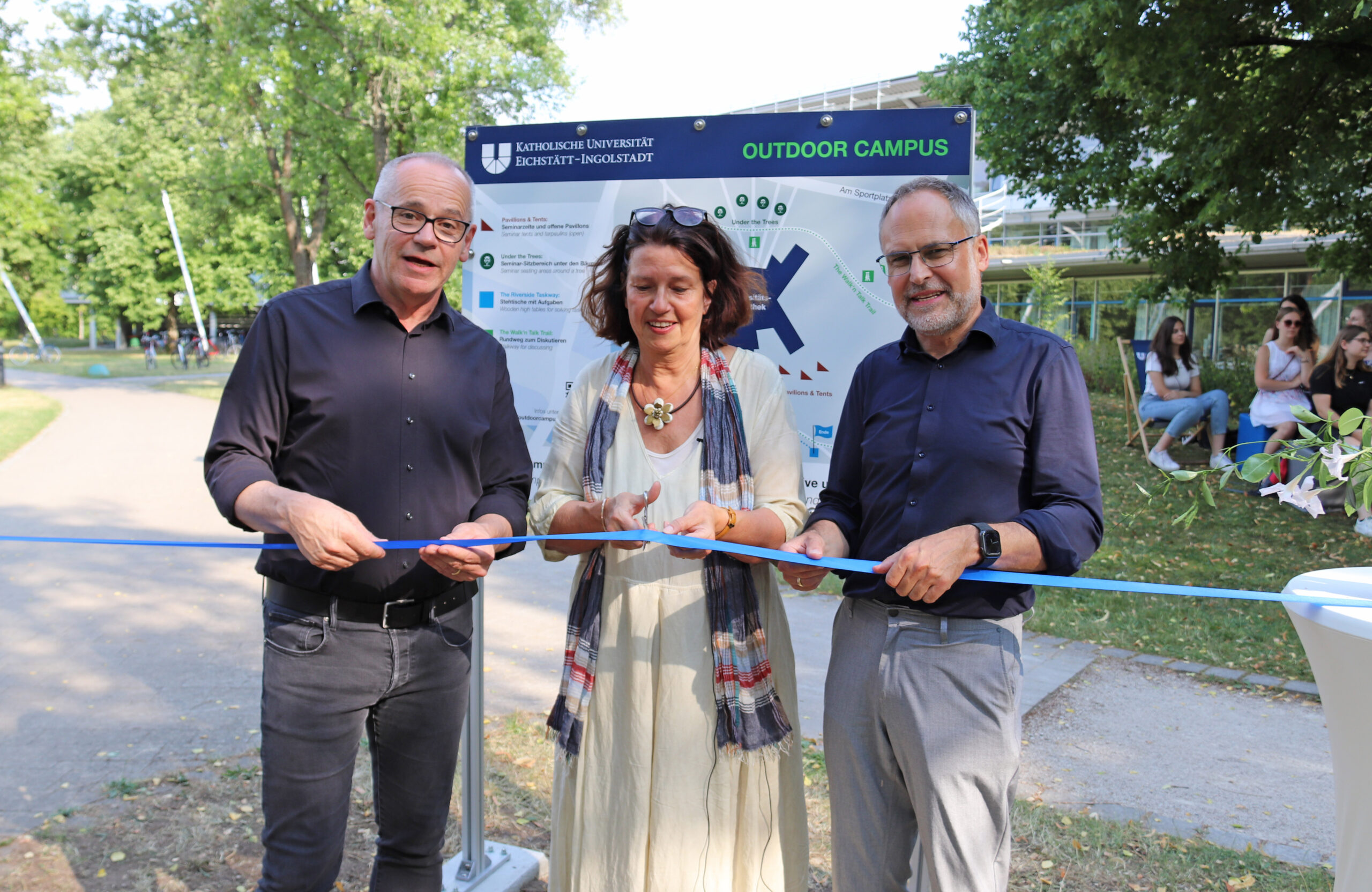Auch wenn das Konzept in der Sprachdidaktik entstanden ist, wollen die Verantwortlichen ganz bewusst Anknüpfungspunkte für andere Disziplinen bieten. Auf der Homepage des Outdoor-Campus, die per QR-Code auch über eine Schautafel an der Zentralbibliothek abrufbar ist, finden sich deshalb beispielhafte Aufgabenformate als Anregung für Dozenten. Bei der feierlichen Eröffnung des neuen Areals betonte KU-Präsidentin Gabriele Gien, dass vom Outdoor-Campus „neue Impulse für alle Fächer der KU ausgehen werden“.