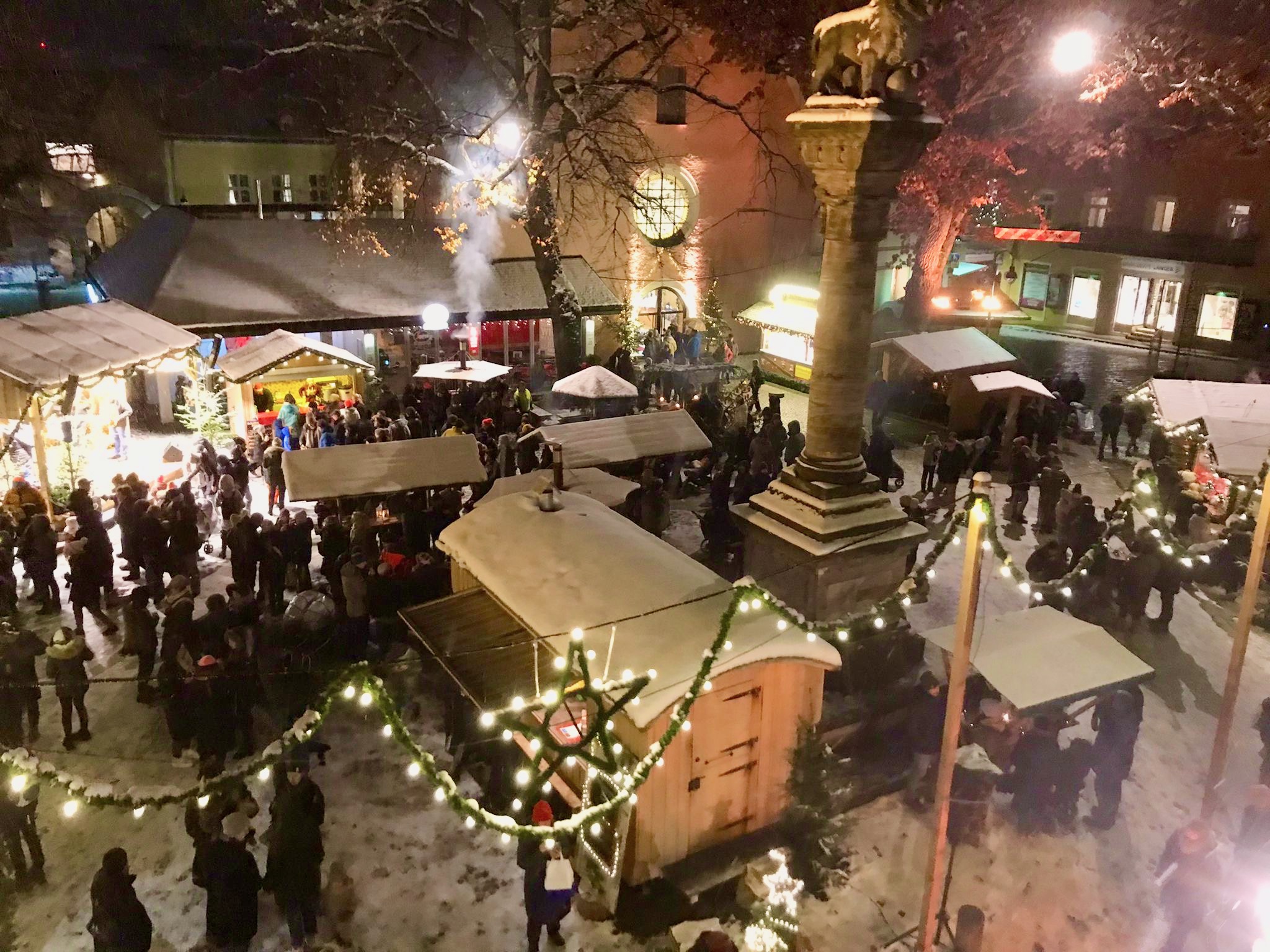 Gestern Abend war es dann noch voller. Ab dem frühen Nachmittag hatten zahlreiche Musikgruppen auf der von Thomas Hollweck von der Tourist Information bespielten Bühne für Stimmung gesorgt – vom Sinfonischen Blasorchester des Gabrieli-Gymnasiums über die „Rolling Horns“, die Alphorngruppe Donauland bis zu „Chorisma“, die am Abend für gute Laune sorgten. Auch am heutigen ersten Advent läuft das bunte Markttreiben bereits wieder – inklusive der Eichstätter Stadtkapelle (17-18 Uhr), einer Tanzvorführung der DJK (18-19 Uhr) und dem alljährlichen „Adventsanblasen“ am Marktplatz (19-20 Uhr), ehe der Abend zwischen den Hütten und am Lagerfeuer am Domplatz ausklingt. Weiter geht es dann an den kommenden beiden Wochenenden in der Winterwelt am Domplatz in Eichstätt – vielleicht schneit es ja wieder.