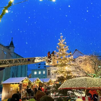 Eichstätt. – Schön war er: der Autakt zum Eichstätter Adventsmarkt. „Besser könnte es gar nicht sein“, fand sogar der Eichstätter Oberbürgermeister Josef Grienberger bei der offiziellen Eröffnung mit Blick auf den romantischem Schneefall, der die Hütten auf dem Domplatz von Beginn an mit einer winterlich-weiße Weihnachtswelt verwandelte – auch durch die Kinder, die im Korb der Feuerwehrdrehleiter den Weihnachtsbaum schmücken durften.