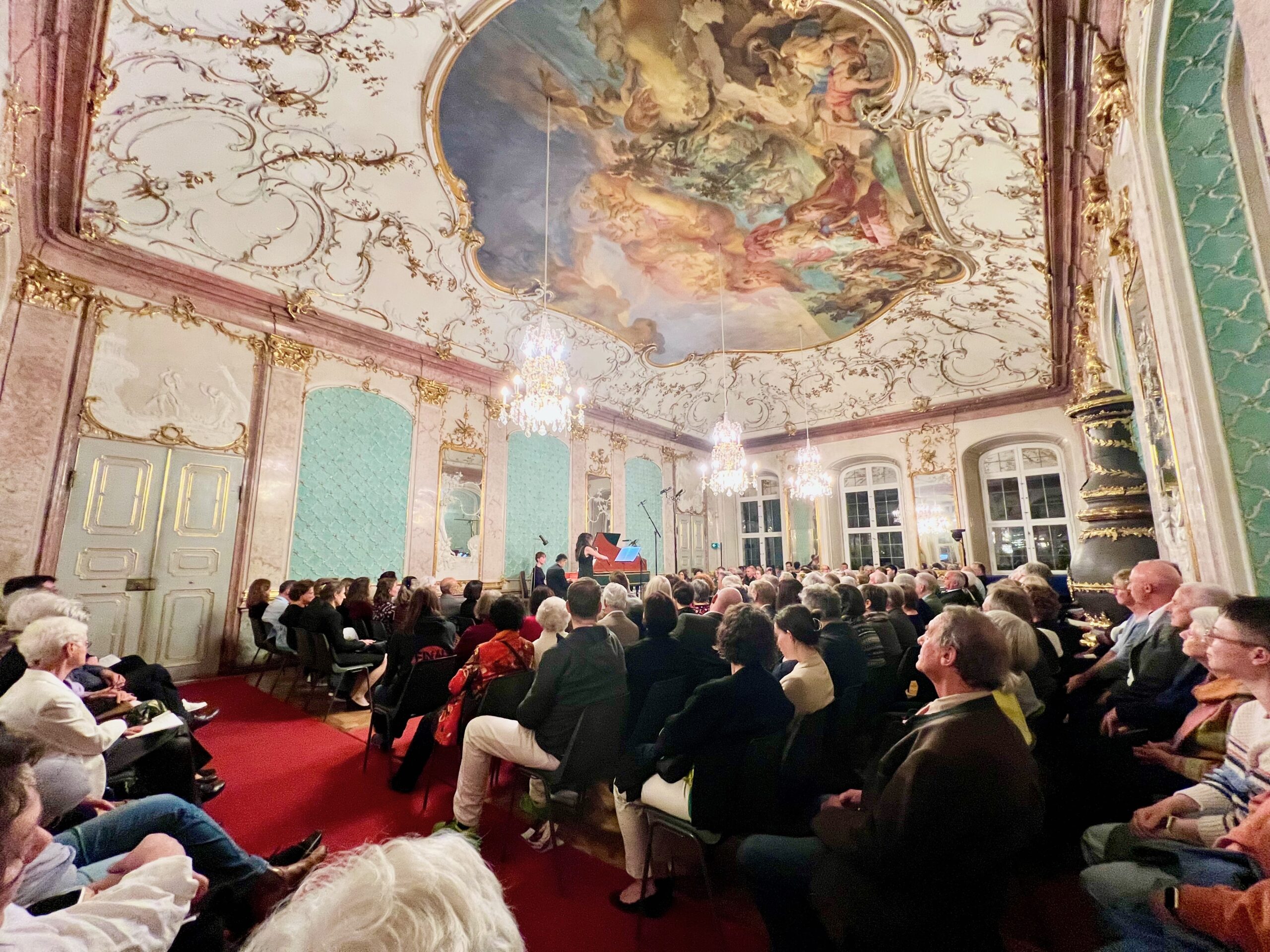 So auch gestern im Spiegelsaal, in dem erneut der Bayerische Rundfunk das „musikalische Duell“ aufzeichnete (zu hören am 6. Juni um 20.05 Uhr auf BR-Klassik), in dem Bach das „Larghetto“ von Händel mit dem „Largo“ seiner Sonate in c-Moll (BWV 1017) konterte. Allegro, Addagio und noch ein Allegro – das Publikum wollte am Ende mehr, und bekam es nach lang anhaltendem Applaus für die beiden Virtuosen auch. „Nach Bach kann man eigentlich nur Bach spielen, sagt man unter Musikern“, erklärte Lina Tur Bonet mit ihrem leichten spanischen Akzent und zeigte anschließend in der „Nachspielzeit“ mit Diego Ares noch einmal, wie gefühlvoll und ausdrucksstark sie mit ihren Instrumenten besondere Orte auch zu einem besonderen musikalischen Erlebnisraum machen können.