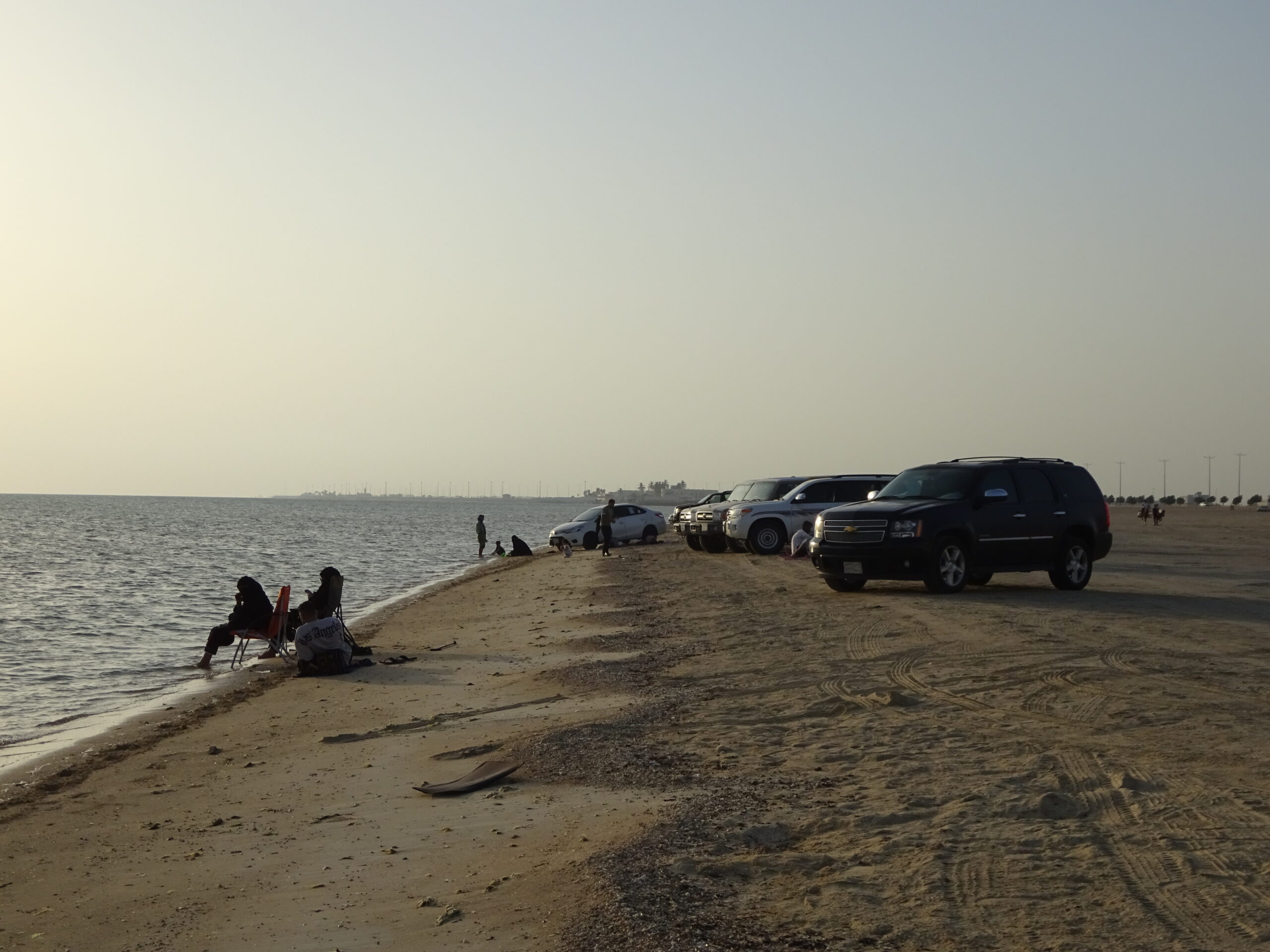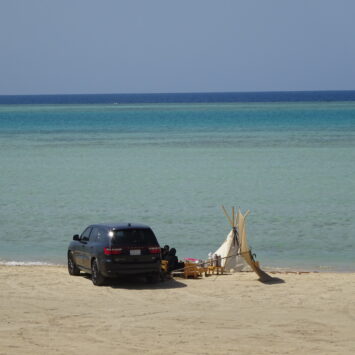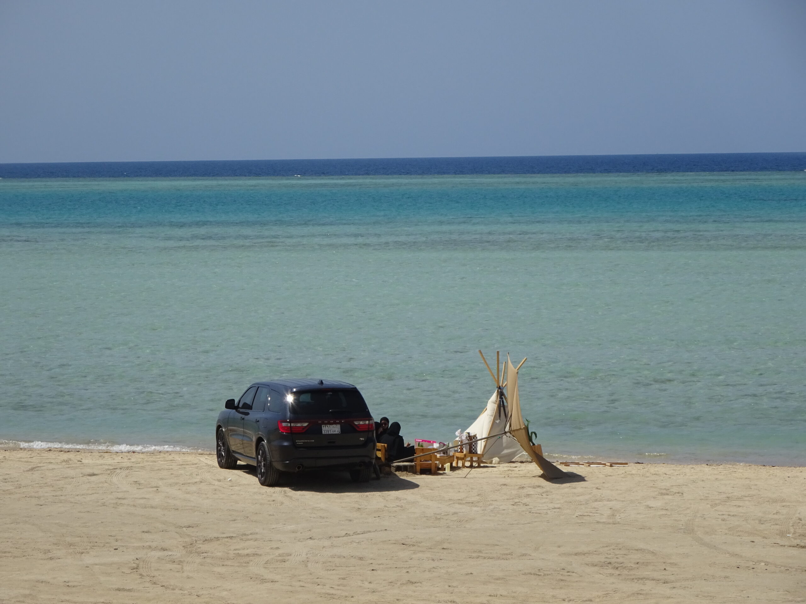 Nach den wunderschönen Tagen in Al’Ula fahren wir zurück nach Yanbu, in der Hoffnung doch noch ein bisschen baden zu können. Alternativ hätten wir über Medina fahren können. Die saudische Tourismusbehörde hat uns allerdings mitgeteilt, dass die Stadt – wie Mekka – nur Muslimen vorbehalten ist. Offenbar gibt es zwar viele Nicht-Muslime, die dort trotzdem übernachten, aber wir halten uns an die vorgegebenen Regeln und wählen die Route am Meer entlang zurück. Deshalb Yanbu. Und nachdem wir diese mal länger in der Stadt sind, merken wir, wie weit Yanbu in der gesellschaftlichen Entwicklung von Al’Ula oder Dschidda entfernt ist. Ich wechsle von Shirts zu weiten, luftigen Tunikas, aber allein durch die unbedeckten Haare erweckt man hier Aufmerksamkeit. Die Kinder sind begeistert von uns „Exoten“, und beim abendlichen Strandspaziergang werden wir bei jeder zweiten Familie zu Kaffee und Datteln eingeladen. Hier fährt man mit dem Auto an den Strand und sitzt im Schatten des Autos auf Teppichen.