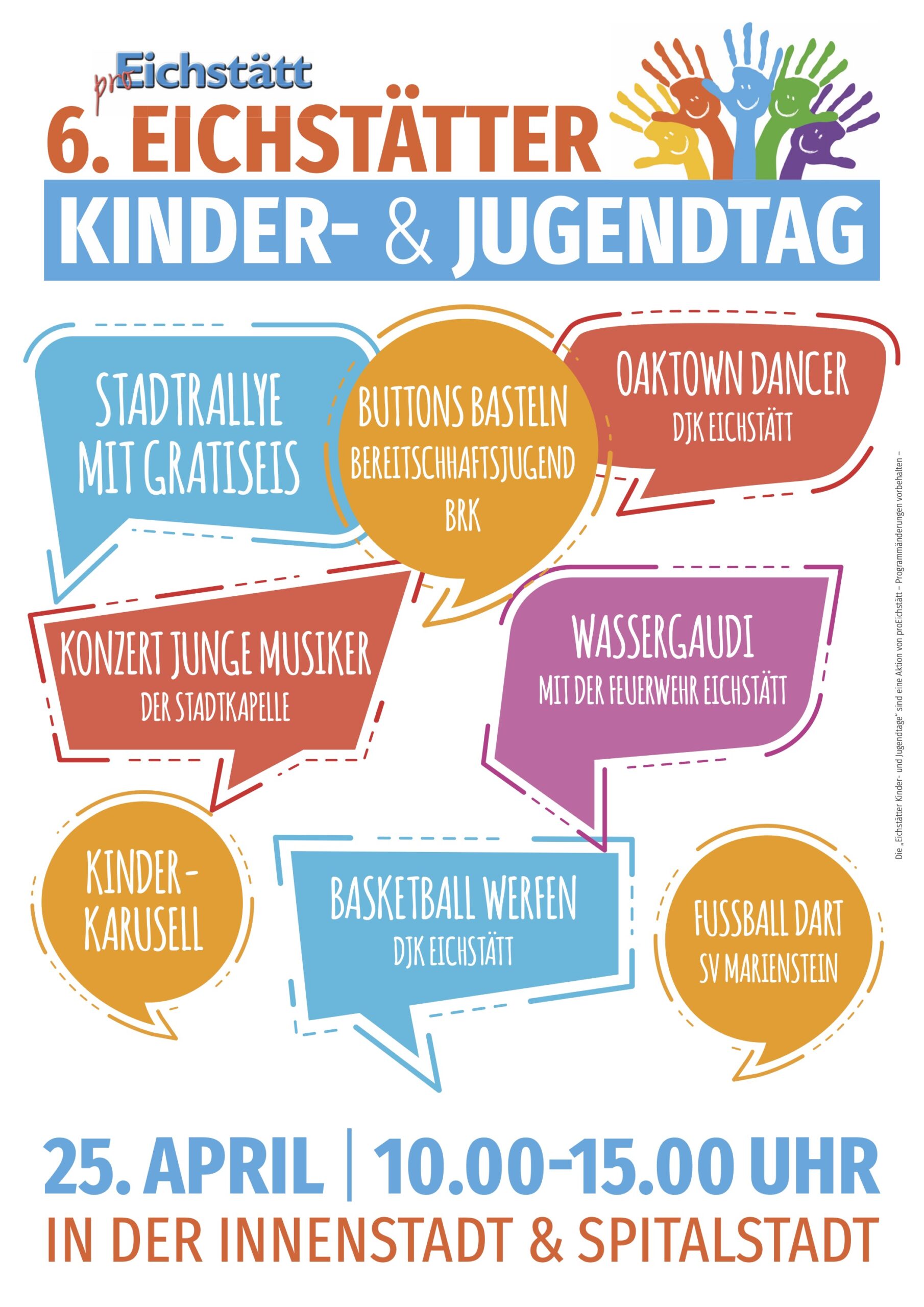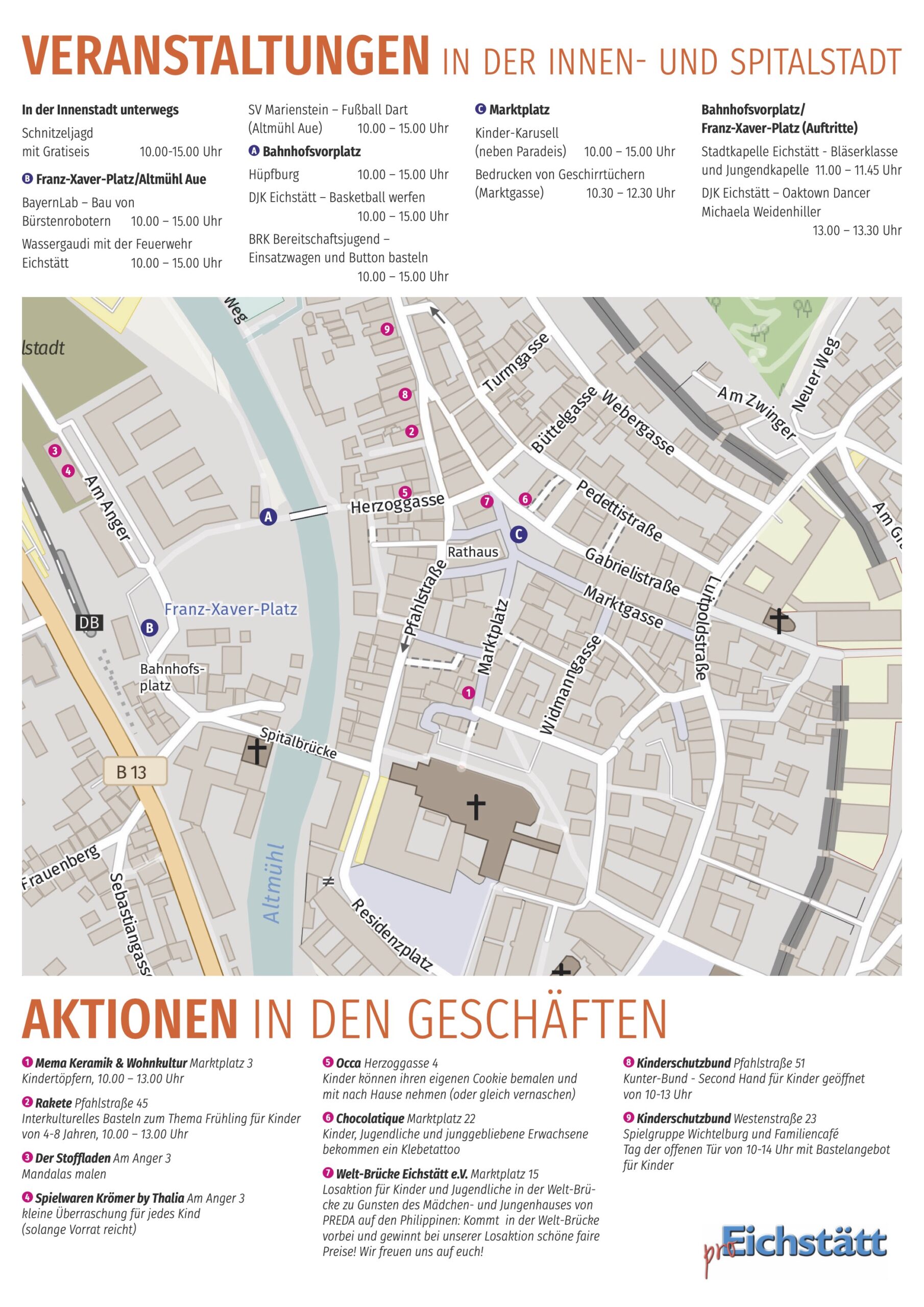 Vom Basketball-Werfen mit der DJK Eichstätt, Buttons-Basteln mit der Bereitschaftsjugend des BRK über ein Fußball-Dart des SV Marienstein bis zum Bedrucken von Geschirrtüchern mit der Naturparkführerin Susann Höltgen gibt es in der Altstadt und der Spitalstadt vielfältige Angebote für die jungen Besucher. Im BayernLab können Bürstenroboter gebaut werden. Der Kinderschutzbund hat seinen „Kunter-Bund“-Secondhand-Laden für Kinder von 10 bis 13 Uhr geöffnet. Die Spielgruppe Wichtelburg und das Familiencafé laden zum Tag der offenen Tür (10-14 Uhr) bei Kaffee und Kuchen sowie einem Bastelangebot für Kinder ein. Dazu kommen besondere Attraktionen wie eine Hüpfburg, ein Karussell, sowie die Wassergaudi mit der Jugendfeuerwehr. Musik von jungen Musikern gibt es um 11 Uhr am Bahnhofsvorplatz von der Bläserklasse und Jugendkapelle der Stadtkapelle Eichstätt. Für weitere Unterhaltung sorgen die Oaktown Dancers (13–13.30 Uhr) der DJK Eichstätt am Bahnhofsvorplatz. Besondere Spannung verspricht die Stadtrallye, die in der Innenstadt und Spitalstadt für Spaß sorgt.